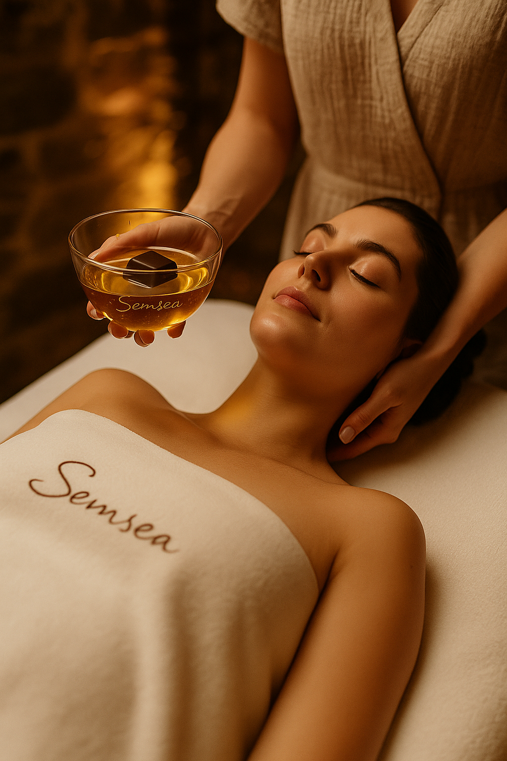 Nettoyage Niagaraet gommage au melon, massage du visage, nuque et épaules à l’huile tiède Chocolat’e©,